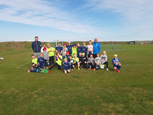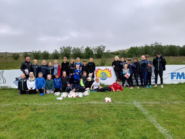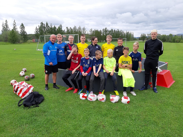 Þvílíkur hópur, 18 krakkar mættir og flestir frá því í fyrra, ætlaði enginn að missa af þessu. Topp þjálfari Bjarki, agi og virðing til fyrirmyndar. Ég spurði Bjarka rétt fyrir upphaf æfingar: -Bjarki, þetta er næstum því sami hópur og í fyrra , eigum við ekki að sleppa pönnuvellinum núna. Svarið var einfalt, ertu ruglaður, krakkarnir eru búnir bíða eftir þessu alla vikuna. Ég gæti alveg verið 365 daga á ári með þessum krökkum og Bjarka, jákvæðni og kraftur á Hofsós. Einn strákur kom frá Fljótunum sem er klukkustundar keyrsla aðra leiðina, þetta gefur lífinu gild . Klöppum fyrir þessum strák og foreldrum hans.