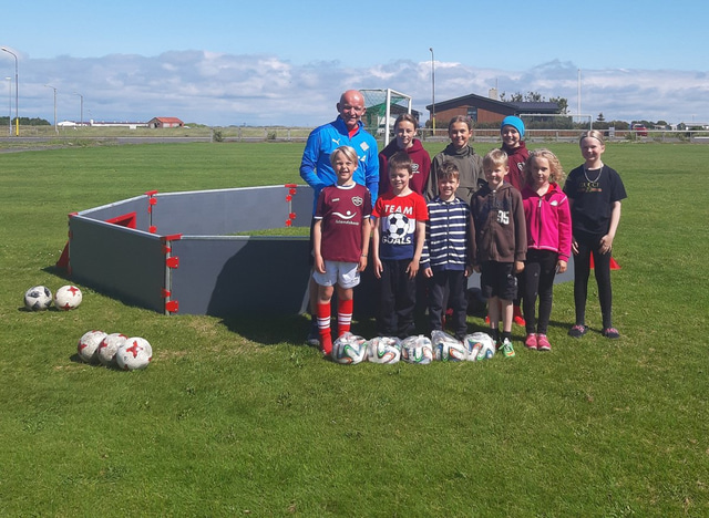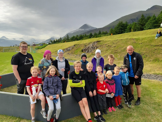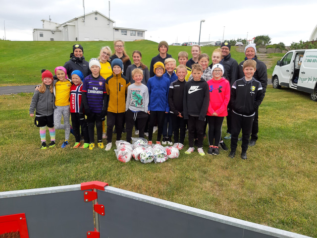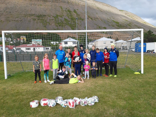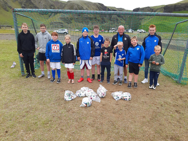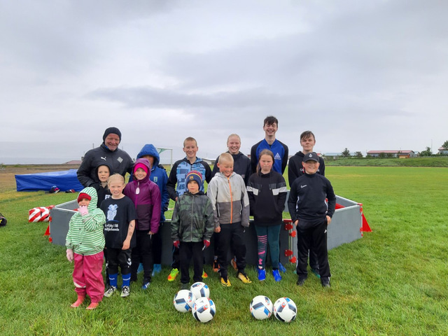 14 krakkar mættir (2 stelpur þurftu að fara aðeins fyrr með ömmu af æfingunni) Sigurður sér líka um allar æfingar hér líkt og á Kirkubæjarklaustri. Pönnuvöllurinn á fullu og krakkarnir mjög áhugasamir um fótbolta og pönnuvöllinn. Frábær staður, mikil fegurð og krakkarnir agaðir og flottir.