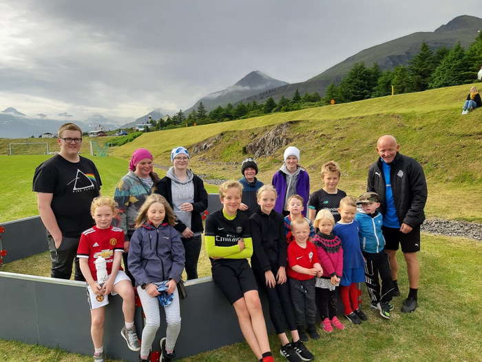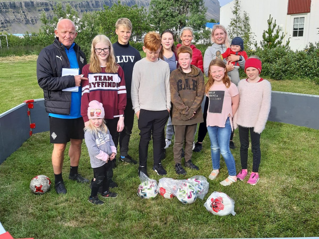 11 krakkar mættir ( vildu ekki öll vera á mynd) Sigmundur og Guðrún að vinna frábært starf , pönnuvöllur klár á staðnum og mikið nýttur, frábært fólk og frábærir krakkar. Sigmundur er búinn að eyða miklum tíma og peningum í þennan pönnuvöll, virðing er eina orðið sem á við , Þingeyri hefur allt til