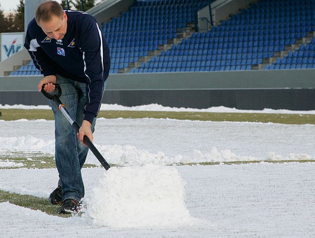 Dúkur yfir keppnisflöt Laugardalsvallarins dugar ekki ef snjóar. Það þarf þá að að fella hann niður, þannig að hann liggur undir snjó á vellinum, sem þarf síðan að moka af.