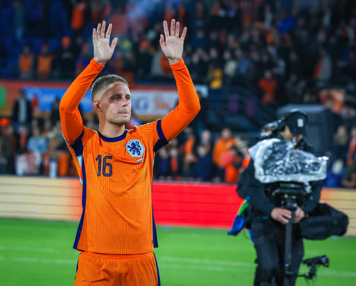 Leikmaðurinn lét það ekki á sig fá því De Jong skoraði annað mark liðsins eftir fyrirgjöf frá hollenska miðjumanninum. Veerman snéri sér að stuðningsmönnunum í kjölfarið og fagnaði.