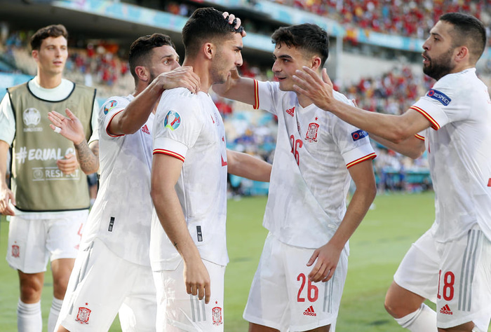 Spánverjar hafa verið í vandræðum með sóknarleik sinn á mótinu, en leikurinn byrjaði ekki vel fyrir þá í dag. Martin Dubravka varði vítaspyrnu Alvaro Morata snemma leiks. Dubravka breyttist hins vegar úr hetju í skúrk þegar hann kýldi boltann í eigið net gríðarlega klaufalega.
