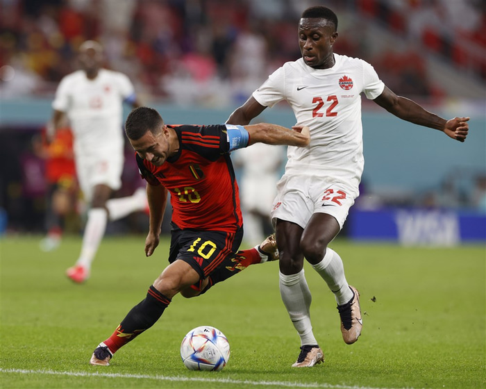 Kanada fékk gullið tækifæri til að komast yfir snemma leiks en Thibaut Courtois varði vítaspyrnu Alphonso Davies.