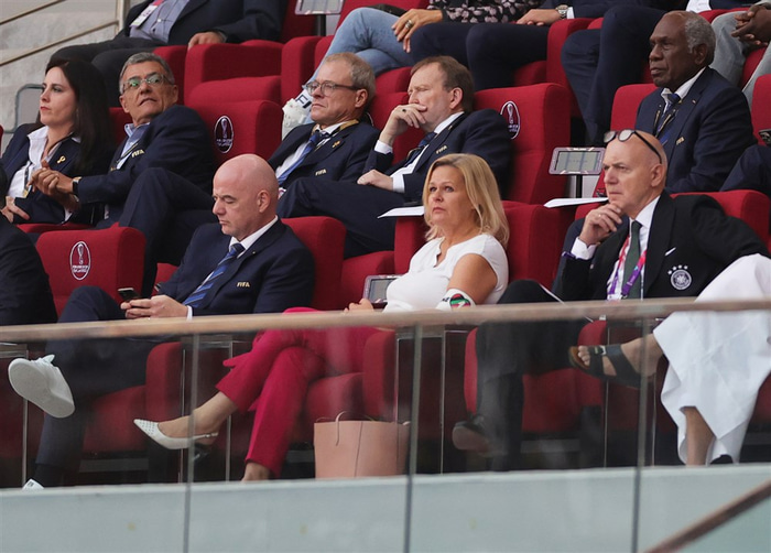 Við hlið Faeser í stúkunni er hinn umdeildi forseti FIFA, Gianni Infantino.