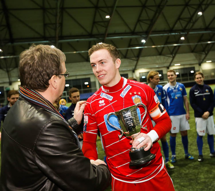 Fyrirliðinn og markvörðurinn Ögmundur Kristinsson tekur við bikarnum eftir sigurinn í Reykjavíkurmótinu.
