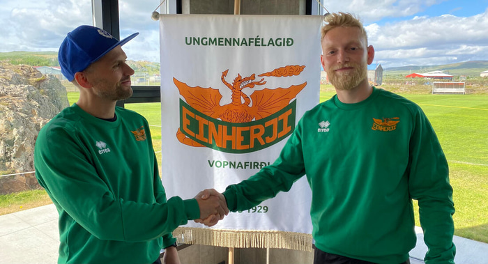 Jón Orri Ólafsson, þjálfari Einherja og Bjartur Aðalbjörnsson, fyrirliði og formaður félagsins gátu fagnað sigri í dag