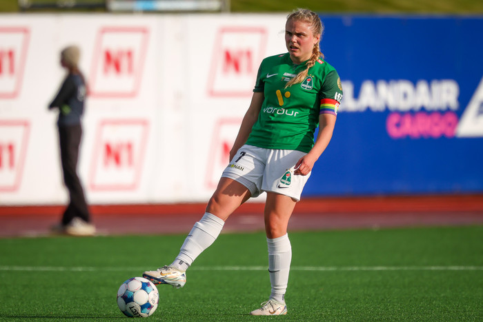 „Mér fannst við bara færa liðið vel varnarlega, þær voru ekki að ná að skapa sér mikið, fengu að vísu skot sem var virkilega vel klárað hjá henni (Álfhildur Rósu) og lítið hægt að vera við því en við sköpuðum fleiri færi en við skoruðum mörk og ég er bara mjög sátt."
