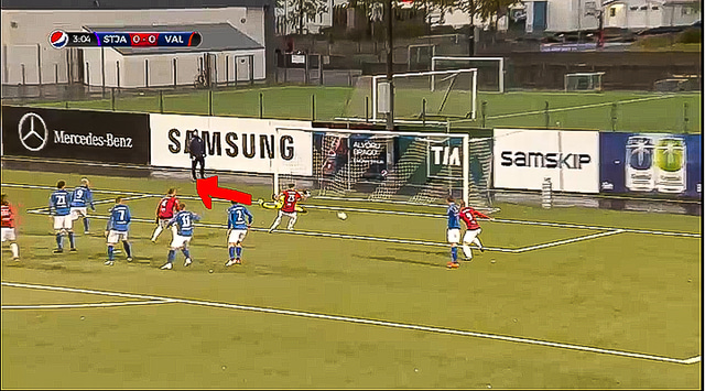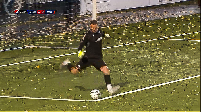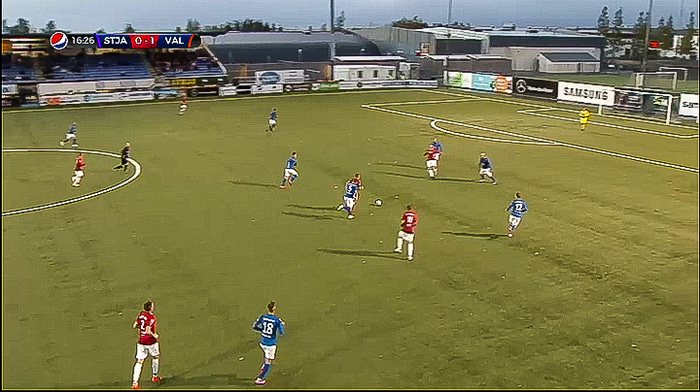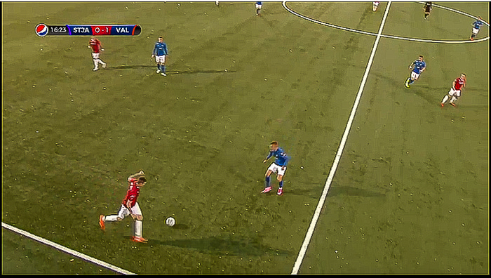 Varnarleikur Stjörnunnar, en einkum Daníels Laxdal, er hálf kómískur í stað þess að standa á ská og vera tilbúinn til að takast á við hlaupið stillir hann sér upp eins og keilu. Snýr beint fram og á aldrei möguleika á að verjast sökum þess.