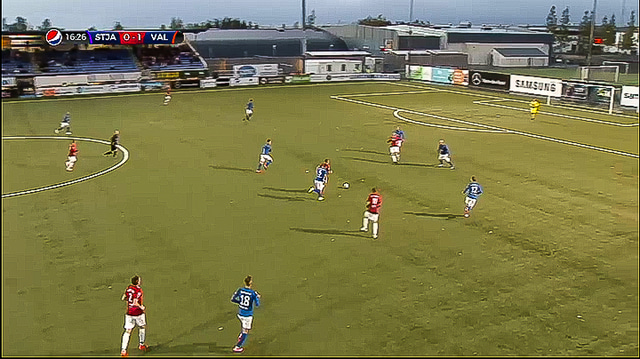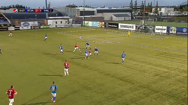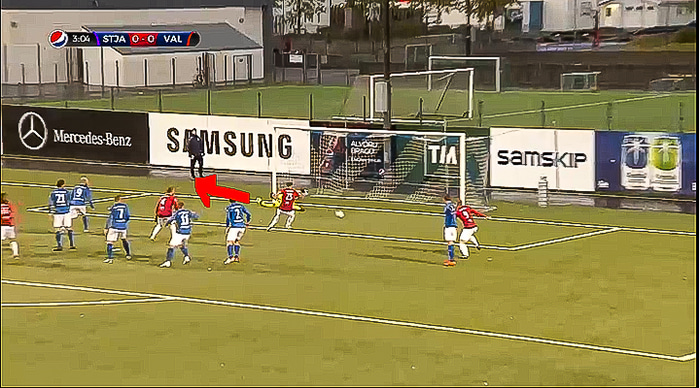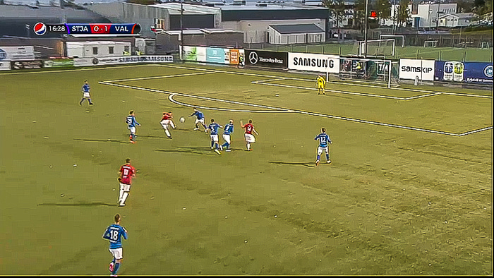 Eftir að hafa fært boltann á milli kanta berst boltinn út á Birki Má. Aron hafði dregið sig niður og miðlægt þannig að Sigurður Egill gat skorið út í millisvæðið. Það sést augljóslega þegar horft er að video-ið að Aron veit að svæðið er opið fyrir sendinguna á Sigurð Egil og hann tímasetur sig fullkomlega inn í svæðið.