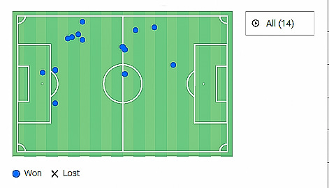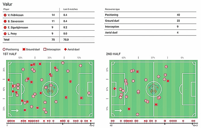 Enginn leikmaður í liði Vals vann boltann oftar en Valgeir Lunddal og myndin að ofan sýnir á hvaða svæðum hann var að vinna boltann. Valgeir er að lesa leikinn vel og styðja vel við pressuna þegar liðið er hátt sem og hliðarfærslur varnarinnar. Mjög skemmtilegur og fjölhæfur leikmaður.