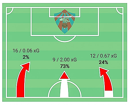 Boltanum er fleytt áfram á Patrik sem er með Daníel í bakinu. Aðrir varnarmenn gera enga tilraun til að valda svæðið sem Daníel skilur eftir sig. Öll grundvallaratriði varnarleiks eru brotin hér og niðurstaðan er mark sem einkennir mjög oft hvernig mörk koma í 4.flokks leikjum.