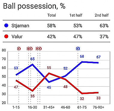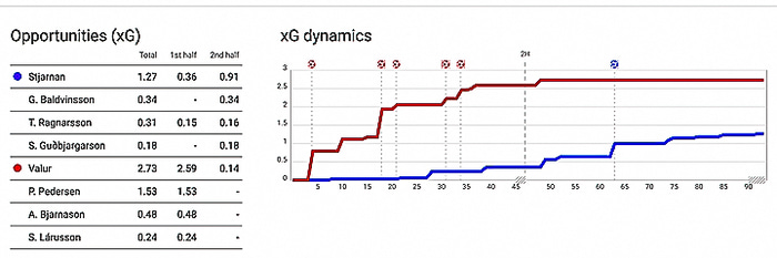 Eins og sjá má á XG grafinu tóku Valsmenn strax völdin og afgreiddu leikinn á fyrstu 35 mínútum hans. Það má hrósa Stjörnumönnum fyrir það að hafa ekki gefist upp heldur barist og hamast á Valsmönnum það sem eftir lifði leiks en Stjörnumönnum tókst aldrei að opna vörn Valsmanna upp á gátt. Heldur urðu þeir að sætta sig við skot utan af velli sem ólíkleg voru til að skila mörkum.