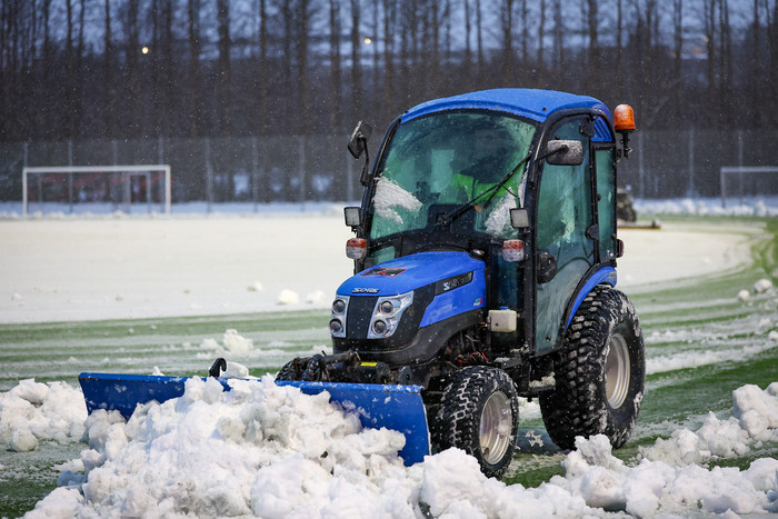 Unnið er að því að moka snjóinn af vellinum til að gera hann leikhæfann.