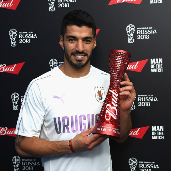 Í leik Úrúgvæa og Rússa var það Luis Suarez sem að skoraði fyrsta mark Úrúgvæa í leiknum og hlaut hann einnig nafnbótina besti maður leiksins og nældi í sinn annan Budweiser bikar á mótinu.
