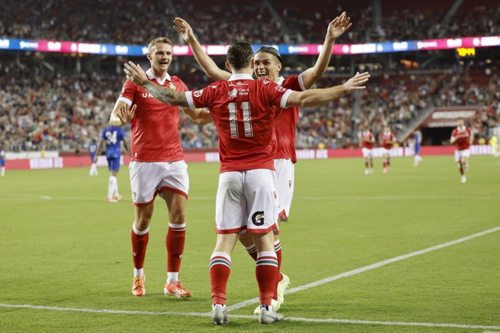 Chelsea og Wrexham gerðu 2-2 jafntefli í æfingaleik á hálftómum Levi's leikvangnum, heimavelli NFL félagsins San Francisco 49ers. Mönnum var heitt í hamsi og handalögmál áttu sér stað eftir aðeins um tveggja mínútna leik.