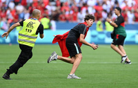 Leik var hætt í uppbótartíma þegar áhorfendur hlupu inn á völlinn en síðustu þrjár mínúturnar í leiknum voru spilaðar tæpum tveimur klukkustundum síðar og það án áhorfenda.