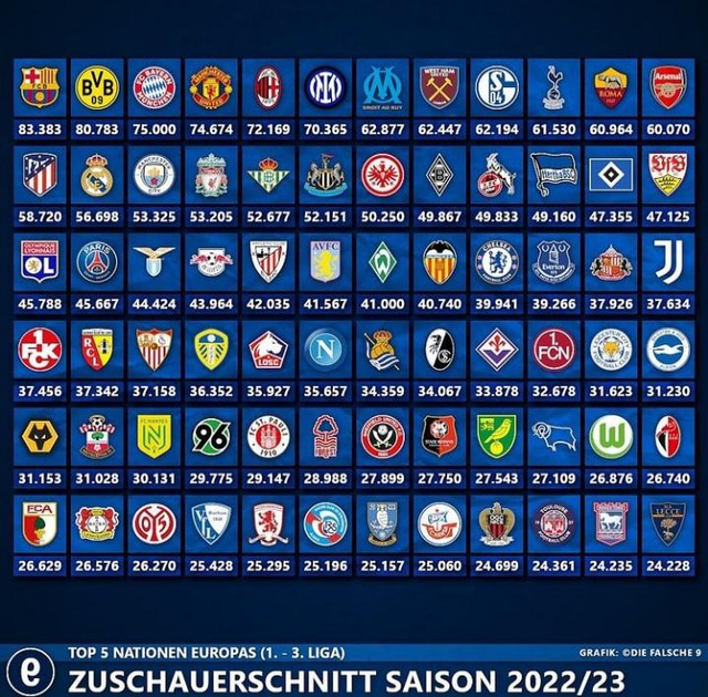 Skemmtileg tölfræði hefur verið að ganga um á veraldarvefnum þar sem meðaláhorfendafjöldi á leikjum í Evrópu er sýndur.