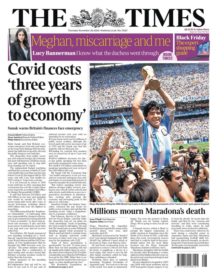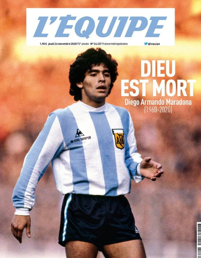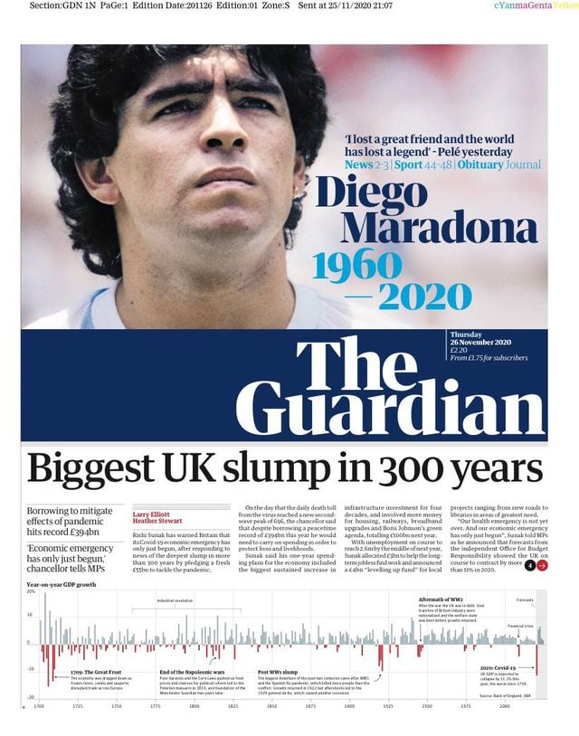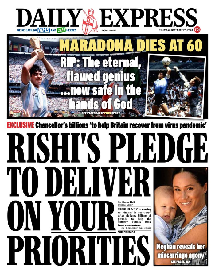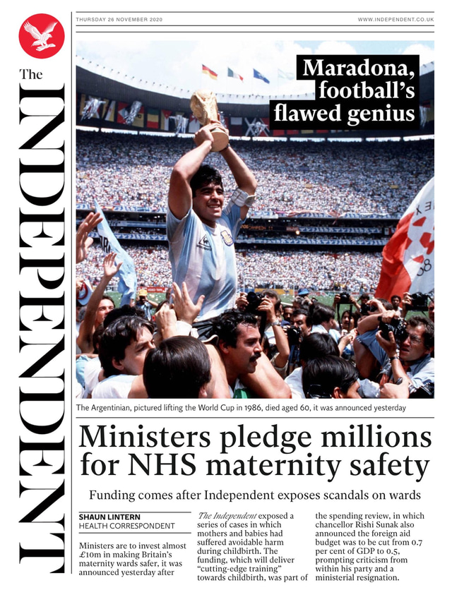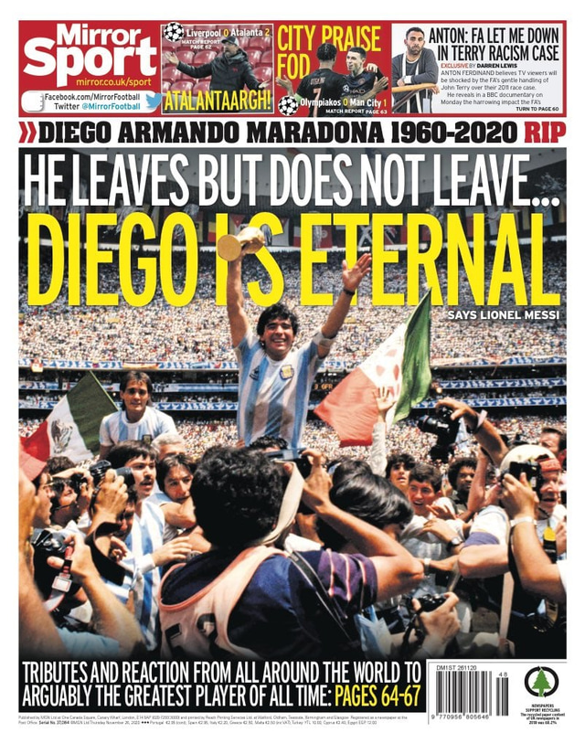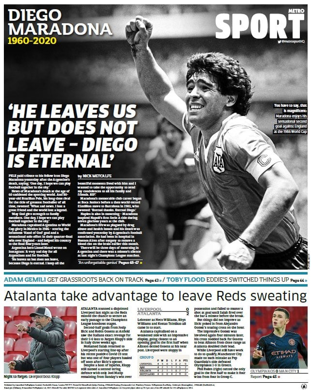 Andlát Maradona kemur mikið við sögu í blöðum morgundagsins á Englandi, og víða annars staðar.