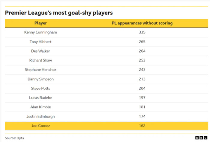 Gomez hefur spilað 162 úrvalsdeildarleiki á ferlinum sem gerir hann að 11. leikjahæsta útileikmanninum í sögu deildarinnar sem ekki hefur skorað mark. Það er Opta sem tekur saman.