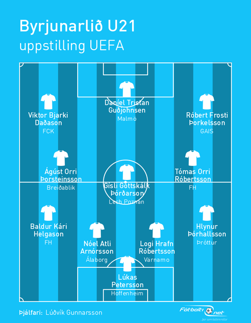 Stærstu nöfnin; Gísli Gottskálk Þórðarson, Viktor Bjarki Daðason og Daníel Tristan Guðjohnsen eru allir í byrjunarliðinu. Daníel og Viktor eru að spila sinn fyrsta leik með U21 landsliðinu og Gísli Gotti er með fyrirliðabandið. Þá er Þróttarinn Hlynur Þórhallsson í liðinu og spilar sinn fyrsta leik í íslensku treyjunni.