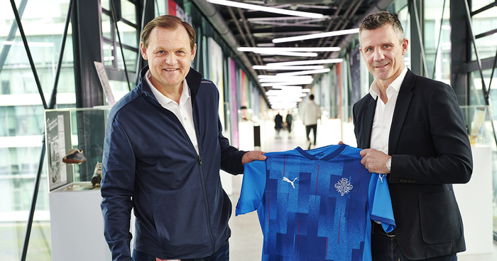 Puma birti í morgun frétt á heimasíðu sinni um samstarfið og þar birtist mynd af Bjorn Gulden framkvæmdastjóra PUMA og Guðna Bergssyni formanni KSÍ en þeir héldu saman á bláum búning.