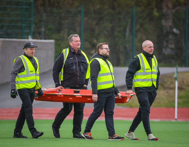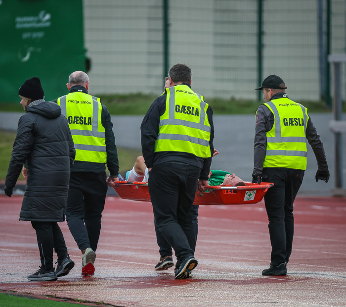Hann fékk þungt högg aftan í mjóbakið og gat ekki haldið áfram en þegar hann var kominn af vellinum þurfti að bera hann af vellinum og eðlilega margir Blikar áhyggjufullir yfir stöðu mála.