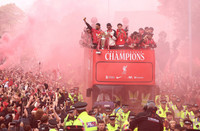 Fagnaðarlátunum er alls ekki lokið í Liverpoolborg en nú er að hefjast skrúðganga með öllu tilheyrandi.