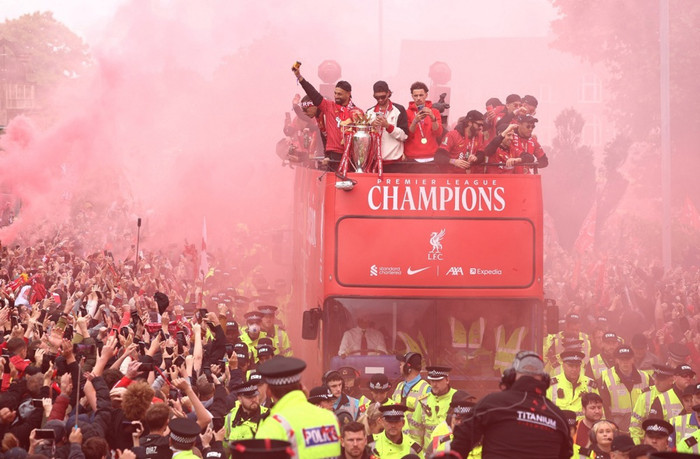 Þúsundir stuðningsmanna voru komnir saman í miðborg Liverpool til að fagna enska meistaratitlinum með liðinu. Leikmenn Liverpool keyrðu í gegnum borgina á þaklausri rútu.