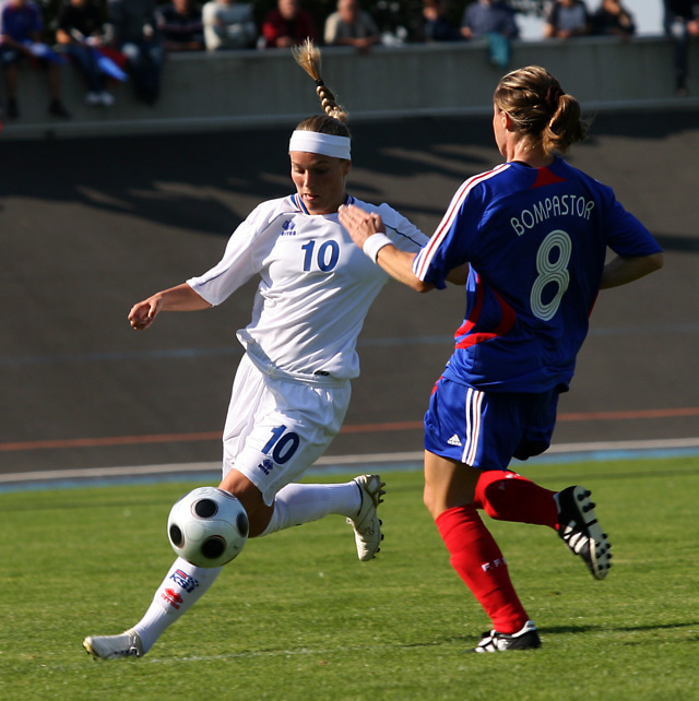 Dóra María var maður leiksins og gerði tvö mörk en Margrét Lára skoraði hitt markið. Þær voru báðar í sterku liði Vals á þessum tíma.