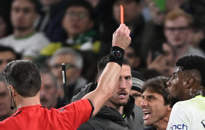 Antonio Conte, stjóri Tottenham, var meira en svekktur og reifst heiftarlega við dómarateymið sem varð til þess að hann fékk rauða spjaldið og er nú á leið í bann.