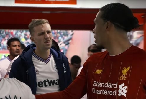 Tékkneski miðjumaðurinn Tomas Soucek hjá West Ham var augljóslega mjög svekktur þegar hann fékk ekki treyju Virgil van Dijk, varnarmanns Liverpool, eftir viðureign liðanna á mánudaginn.