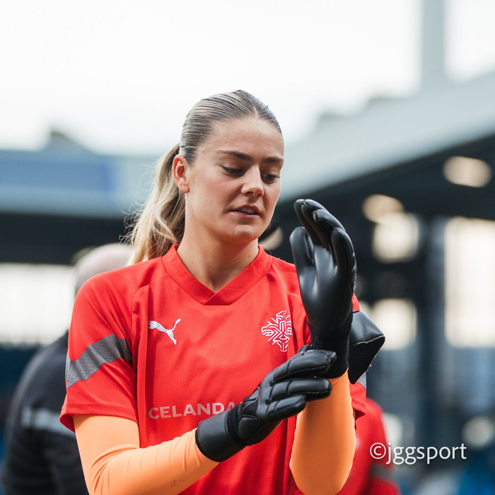 Telma Ívarsdóttir stóð á milli stanganna í liði Íslands á Kópavogsvelli í dag þegar liðið mætti Serbíu í umspili Þjóðardeildar UEFA. íslands bar þar sigur úr býtum 2-1 og tryggði sér þar með áframhaldandi veru í A-deild Þjóðardeildarinnar. Tilfinningin hefur væntanlega verið góð fyrir Telmu í leikslok sem var ekkert að fjölyrða um það.„Já tilfinningin er virkilega góð og mér hefur sjaldan liðið betur.“
