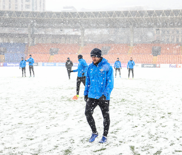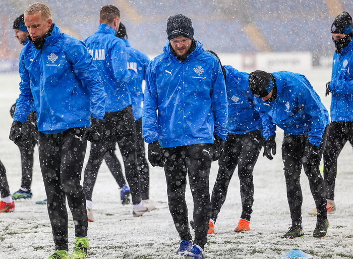 Ísland mætir þar heimamönnum í undankeppni HM 2022 klukkan 16:00 á morgun og þegar liðið mætti á æfingu dagsins snjóaði mikið og völlurinn var alhvítur.