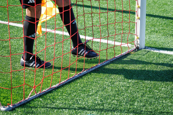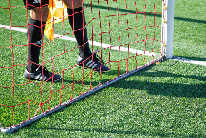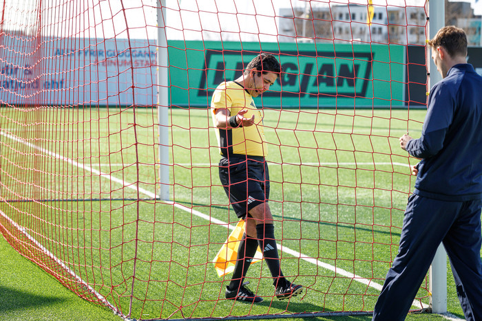 En þegar kom að því að hefja leik var ekki enn búið að laga markið svo leikurinn tafðist um einhverjar mínútur.
