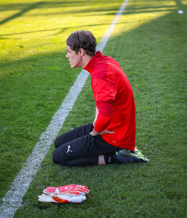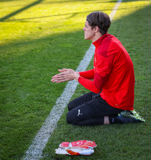 Adam Ingi vakti athygli hjá Fótbolta.net í Tékklandi í gær fyrir athöfn sem hann virðist framkvæma áður en hann gengur inn á völlinn til að hefja æfingu á keppnisvellinum.
