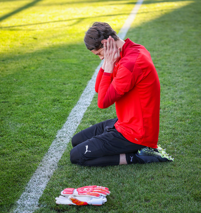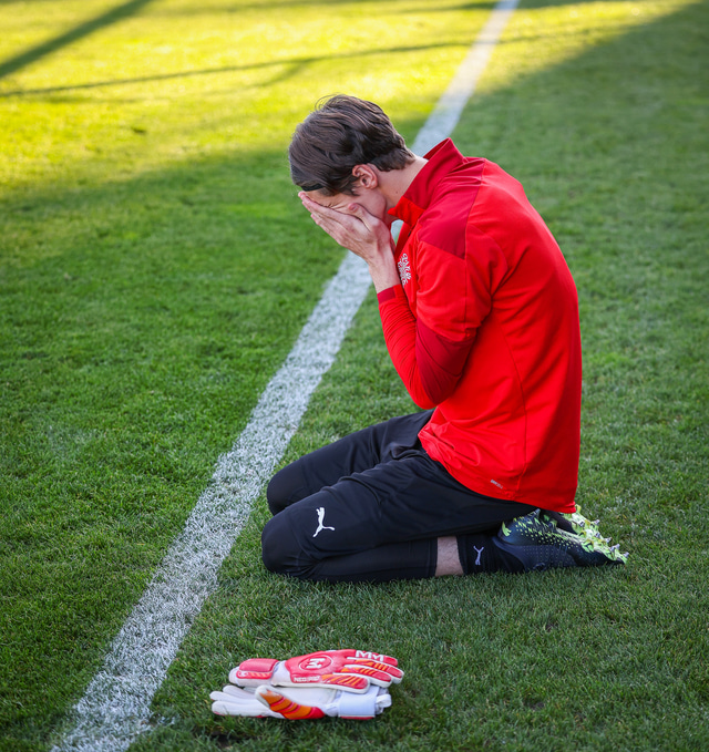 Myndir af þessu má sjá hér að neðan en hann settist við hliðarlínuna, setti hendurnar inn á völlinn og strauk sér í framan.