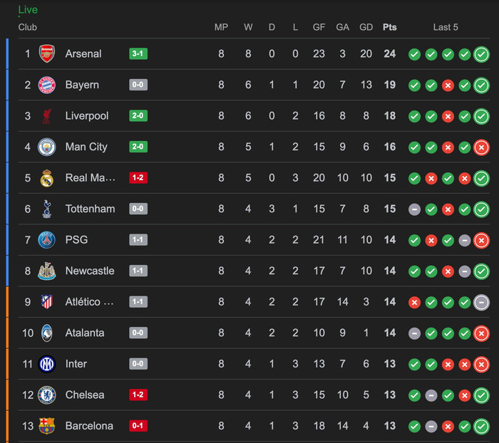 Chelsea og Newcastle eru einnig í topp átta. Ef þau vinna Napoli og PSG eru þau örugg áfram í 16-liða úrslitin. Jafntefli gætu nægt öllum liðum í topp átta en það fer auðvitað eftir úrslitum úr öðrum leikjum.