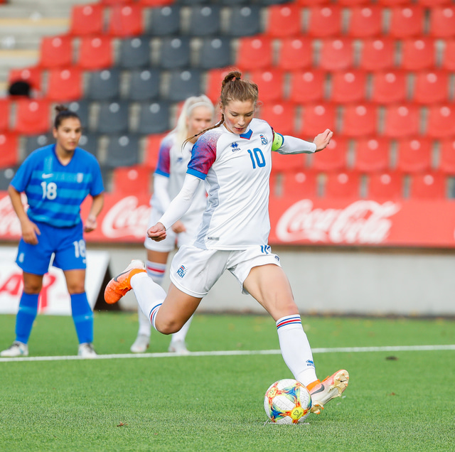 Karólína Lea Vilhjálmsdóttir er ein efnilegasta fótboltakona Íslands. Hún er 19 ára landsliðskona sem er á mála hjá stórliði Bayern München í Þýskalandi.