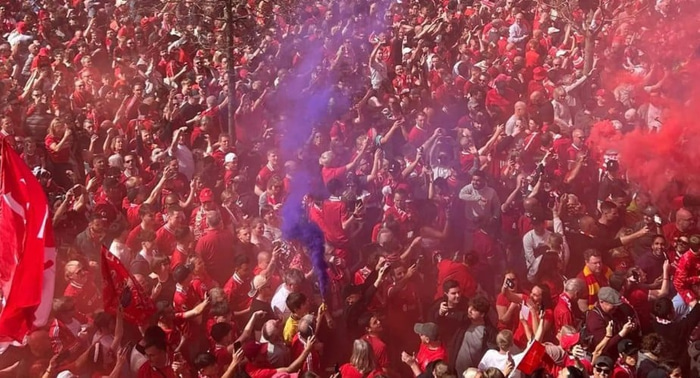 Í gær kom síðan að stundinni. Stuðningsmenn mættu fyrir utan Anfield til að taka á móti liðinu með blysunum sem voru flest með rauðum reyk, en það voru þó nokkrir steinhissa þegar blár reykur kom upp úr nokkrum blysum.