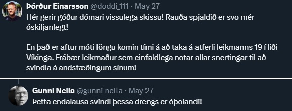 „Það er löngu komimn tími á að taka á atferli leikmanns 19 í liði Víkinga. Frábær leikmaður sem einfaldlega notar allar snertingar til að svindla á andstæðingum sínum!" skrifaði Þórður Einarsson, yfirþjálfari yngri flokka hjá Þrótti, sem er meðal þeirra sem tjáir sig á X.