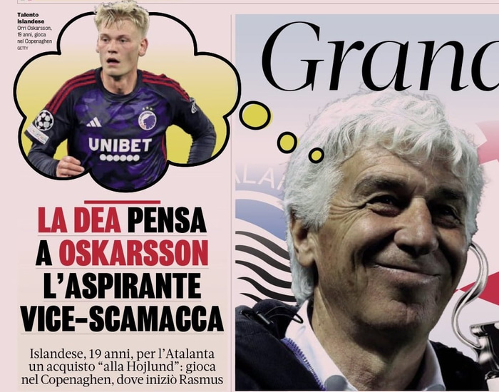 í blaðinu má sjá samsetta mynd þar sem Gian Piero Gasperini, stjóri Atalanta, er að hugsa um Orra. Gasperini stýrði Atalanta til sigurs í Evrópudeildinni í síðustu viku þegar liðið lagði Bayer Leverkusen í úrslitaleik.