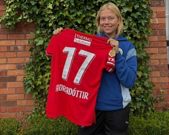 Hafrún Rakel Halldórsdóttir leikmaður Brøndby ásamt Elísabetu Ásu sem greindist með Acnes taugasjúkdóminn árið 2024. Hún er ein af fáum í heiminum sem bera þessa tegund af sjúkdómnum. Málefni: Einstök Börn