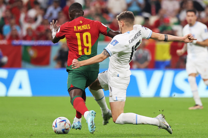 Nuno Mendes bakvörður portúgalska landsliðsins og PSG var tæpur fyrir leik liðsins gegn Úrúgvæ en var þó talinn nógu klár til að byrja leikinn.