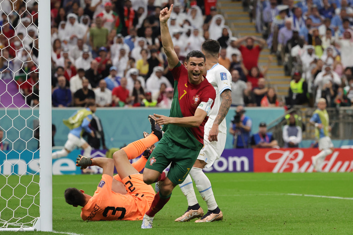 Cristiano Ronaldo fagnaði fyrra marki Portúgal eins og það væri sitt eigið og það var skráð á hann í fyrstu en að lokum fékk Bruno Fernandes markið skráð á sig.