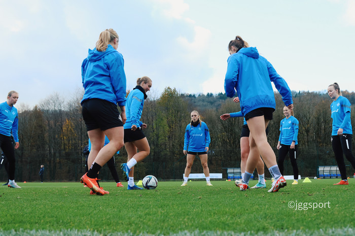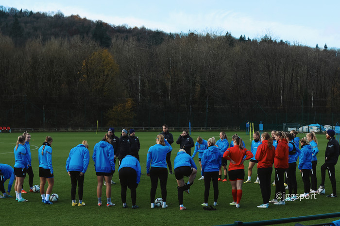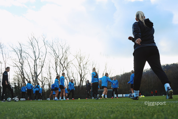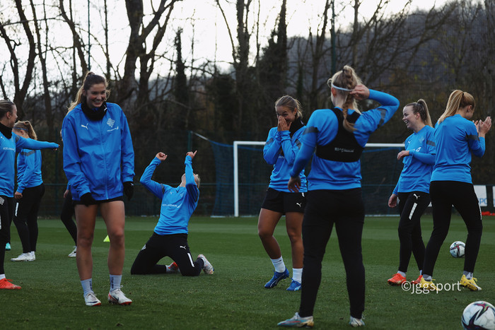 Fyrsta æfingin var svo steinsnar frá keppnisvellinum, Cardiff City Stadium rétt fyrir hádegið í dag. Jólaandinn sveif líka yfir þar því Glódís Perla Viggósdóttir fyrirliði hafði tekið saman uppáhalds jólalögin sín og þau voru spiluð í hátalara á æfingasvæðinu fyrir æfingu.