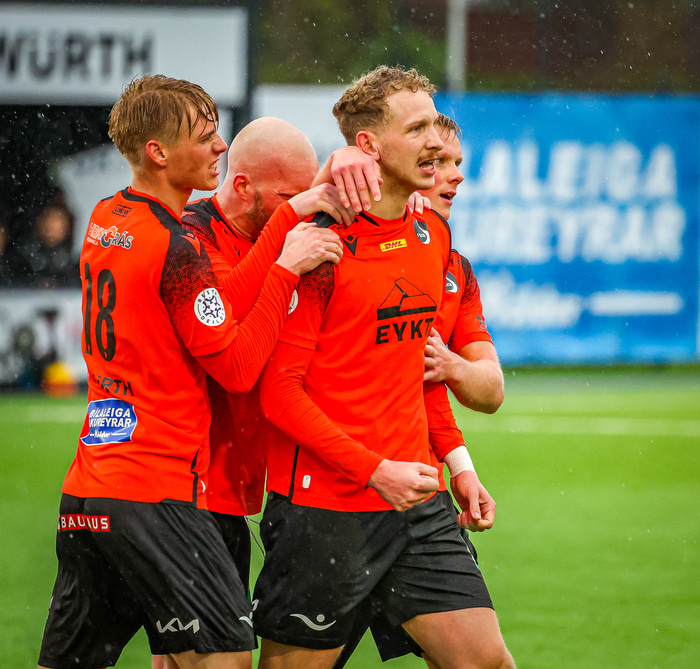 KA-mönnum er létt eftir 4-2 sigur gegn Fram. Jakob Snær Árnason kom af bekknum og tryggði KA sigurinn með tveimur mörkum. Bjarni Aðalsteinsson skoraði einnig en hann var frábær í liði Akureyringa.