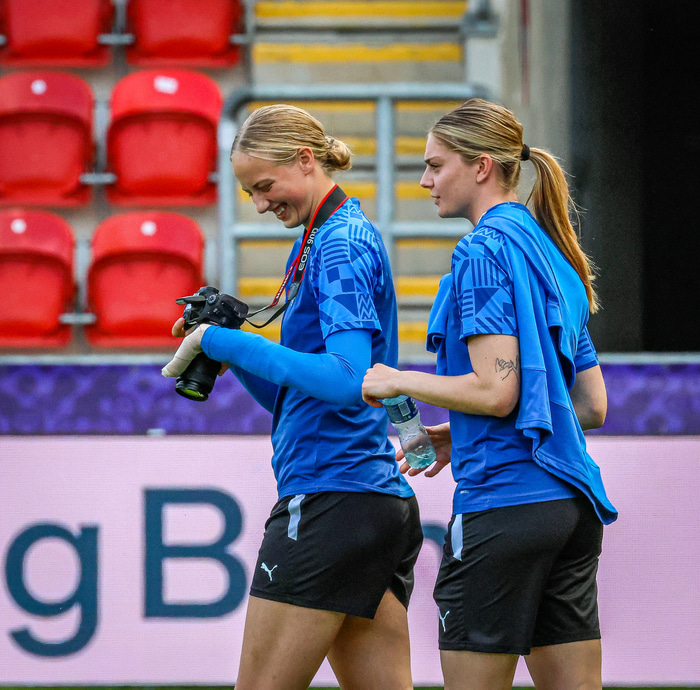 „Það er gaman að hitta loksins stelpurnar, bara geggjað, Það er alltaf jafn leiðinlegt að sitja heima og horfa á leikina í sjónvarpinu," segir Cecilía.
