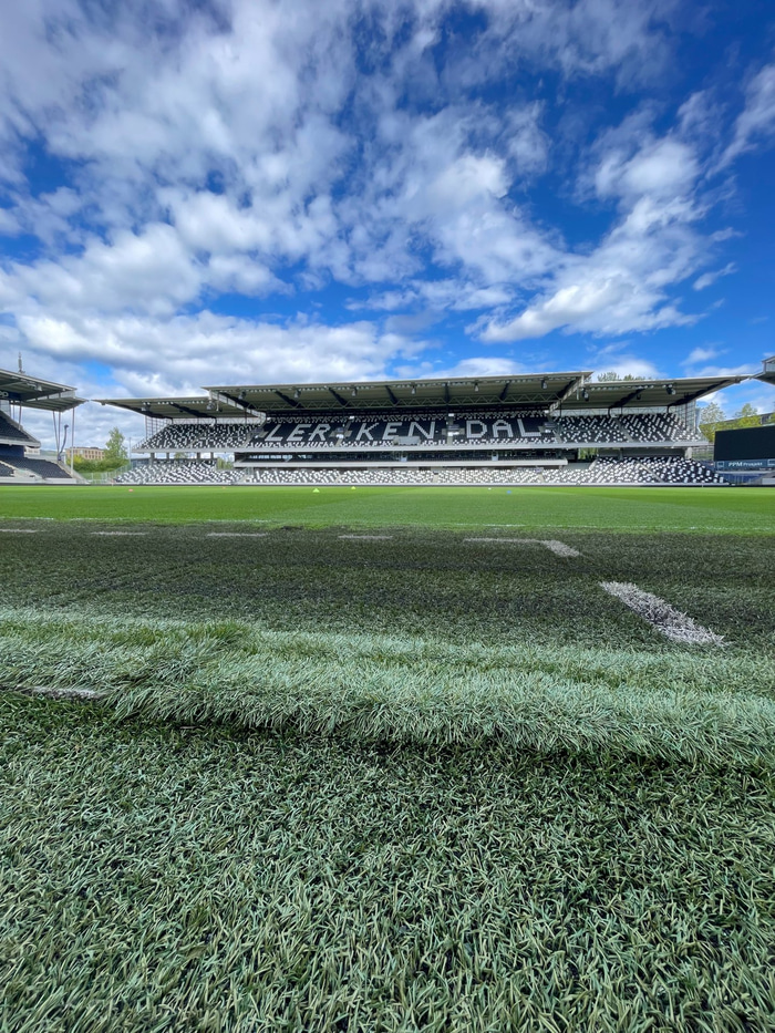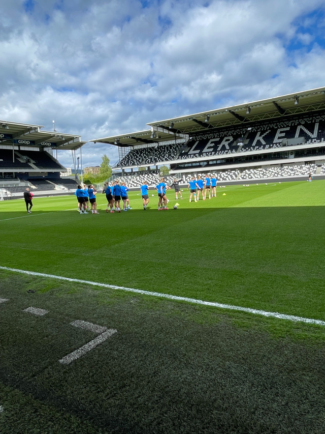 Útsýnið á efri hæðum Scandic Lerkendal hótelsins er skemmtilegt. Hér getur undirritaður bara horft beint út á hinn sögufræga Lerkendal leikvang sem hýst hefur marga stóra fótboltaleiki í gegnum tíðina og á morgun spilar íslenska kvennalandsliðið hér við Noreg í Þjóðadeildinni.