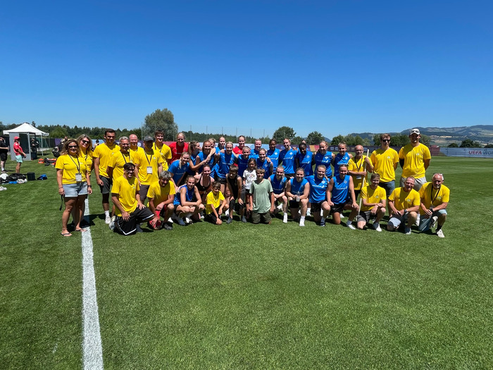 Það var stór hópur kominn saman þegar Fótbolti.net mætti á staðinn fyrr í dag og var búið að gera sérstaka bolti fyrir félagsfólkið. Voru þeir merktir 'EM 2025'.