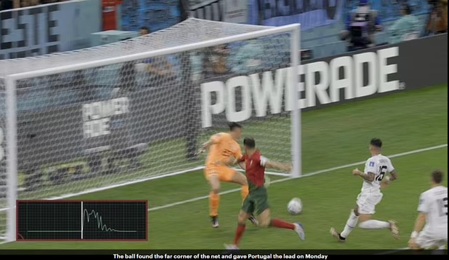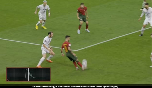 Í leik Portúgal og Úrúgvæ, með því að nota Connected Ball tæknina í Al Rihla boltanum, þá getum við sýnt fram á að Cristiano Ronaldo snerti ekki boltann í opnunarmarki leiksins. Ekki var hægt að mæla neinn ytri kraft á boltann eins og sést á meðfylgjandi grafík. Skynjarinn inn í boltanum gerir okkur kleift að vera mjög nákvæmir í greiningu okkar.